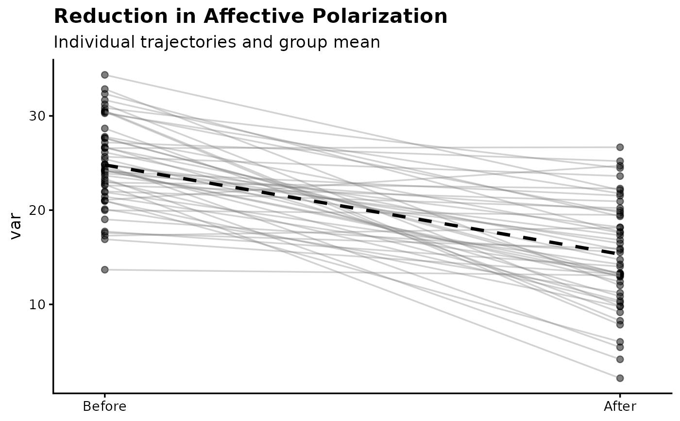 Creates a publication-ready paired (within-subject) spaghetti plot. Individual participant trajectories are shown as connected lines with optional mean overlay. Designed for pre-post designs and other two-condition repeated measures outcomes.